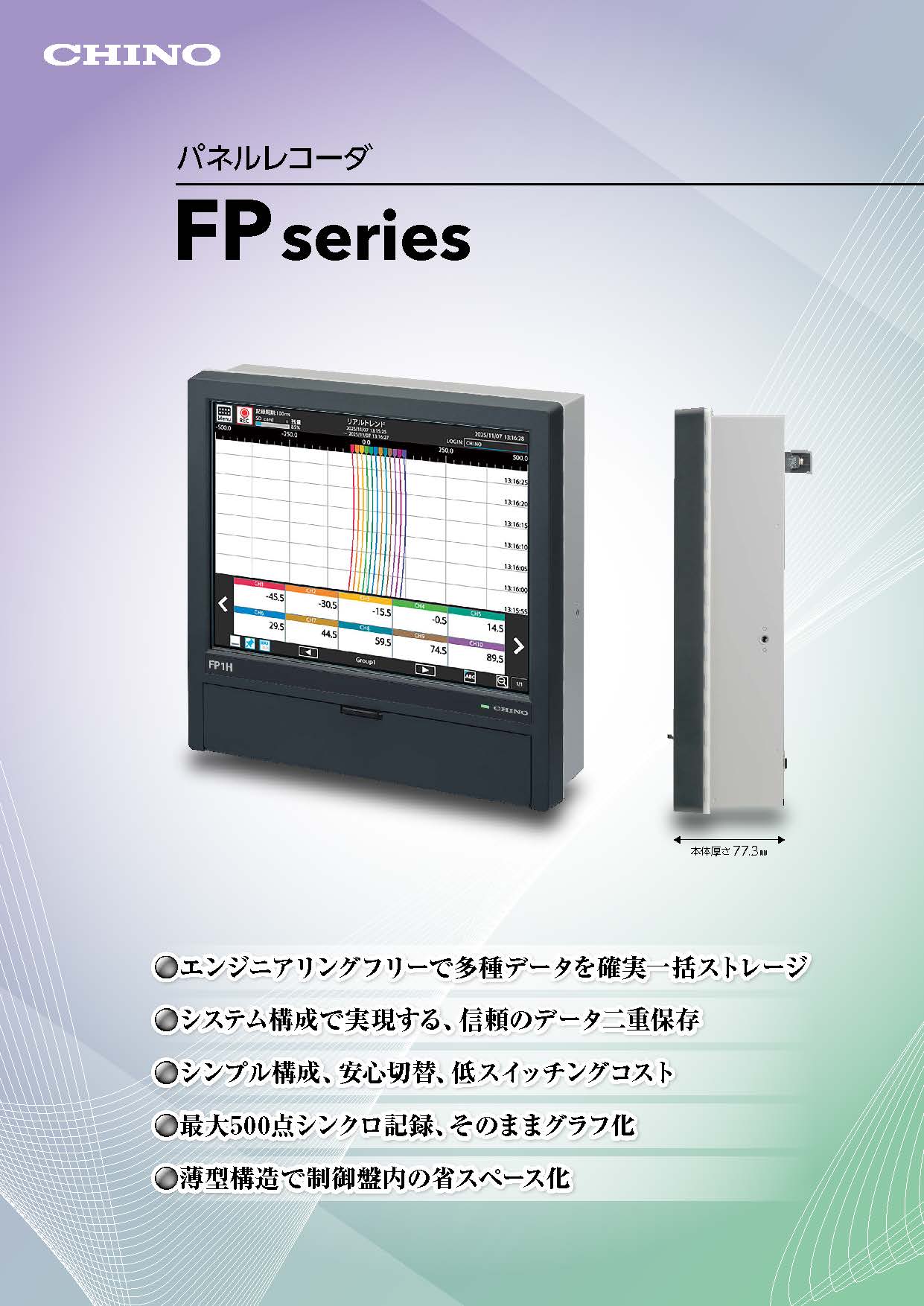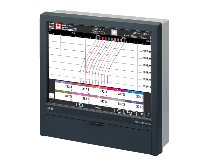 「パネルレコーダFP」は最大500点の計測データを一括管理できるレコーダです。データロガーFEシリーズ等にセンサを接続して計測し、イーサネット経由でFPへ転送し、データのグラフ化などはFPで行われます。