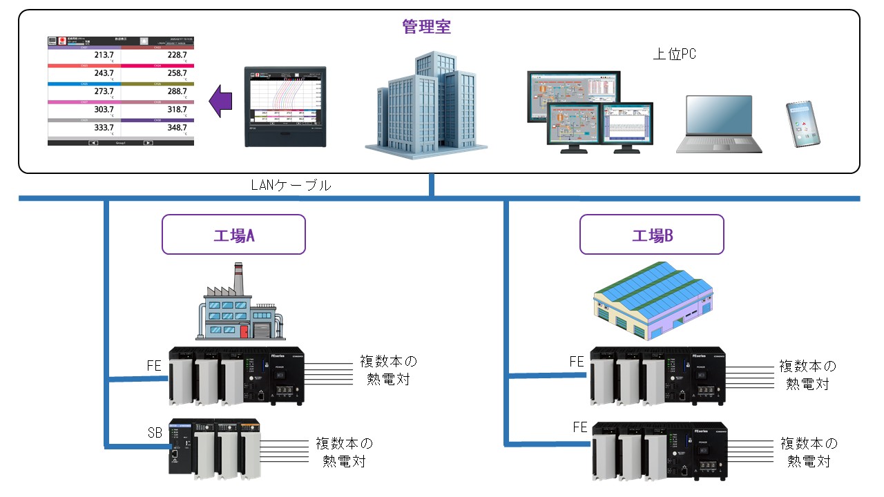 下記例では、工場Aと工場Bにそれぞれ多数の温度測定ポイントがあり、工場内はデータロガーやモジュール調節計までにとどめておきます。各データロガーやモジュール調節計からイーサネットを介し、事務所にパネルレコーダ1台だけで工場AとBの全ての計測データが監視できるようになっています。つまり、長距離配線はLANケーブルのみとなります。