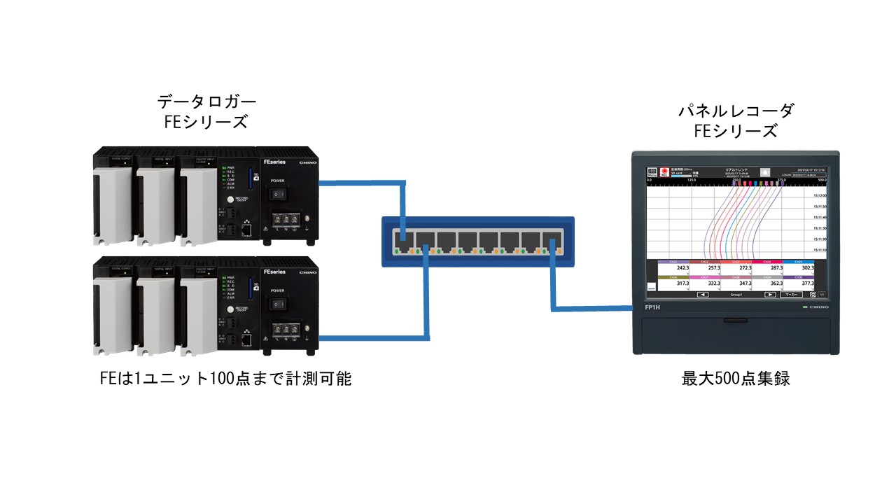 データロガーFEは1ユニット最大100点まで入力・記録ができます。複数のFEユニットとFPをハブを通してLAN配線することで、最大500点の監視が1台で可能になります。