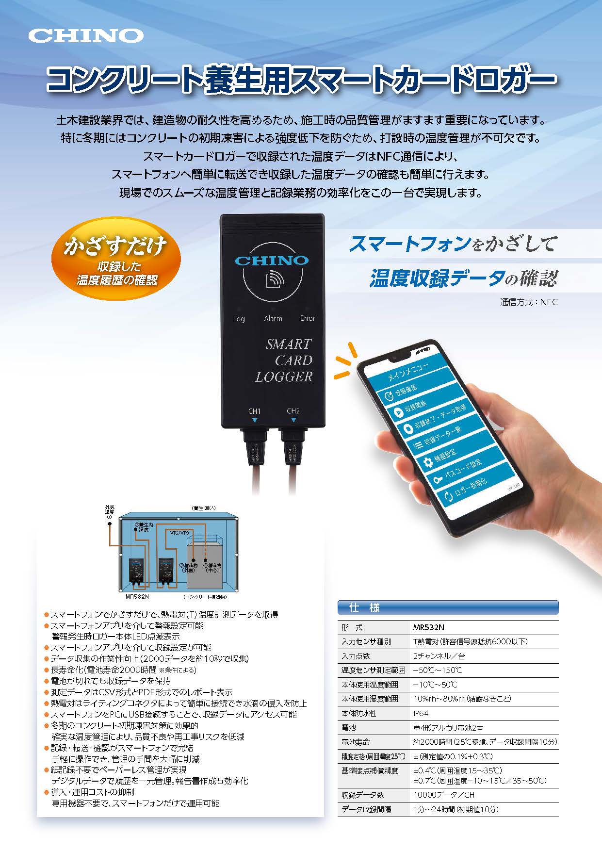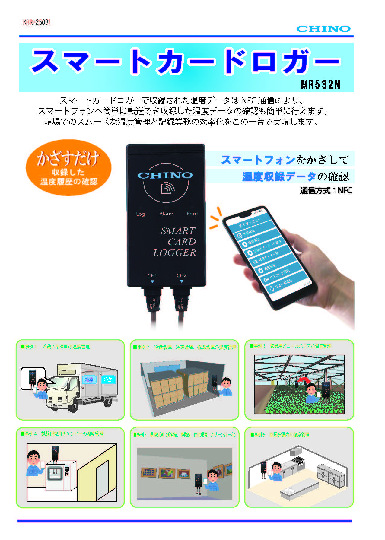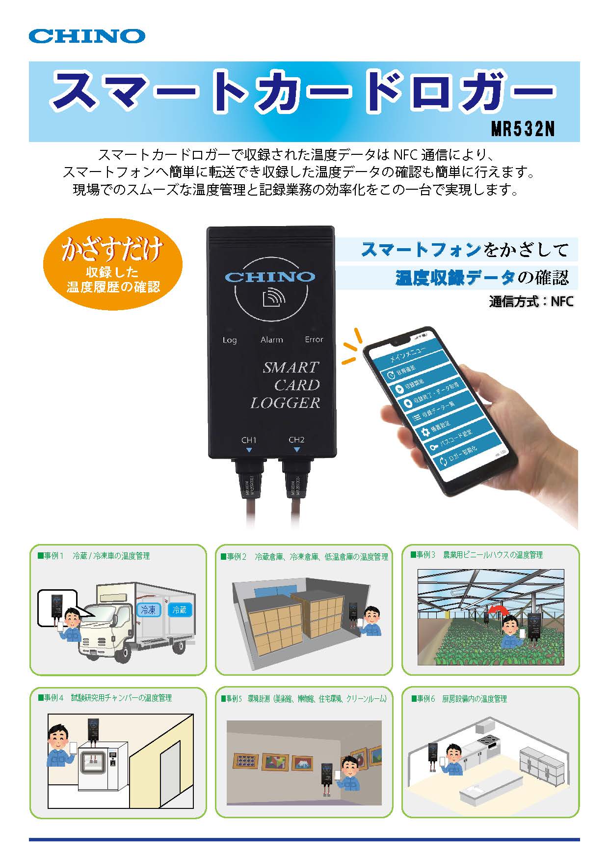 スマートカードロガー「MR532N」で記録した温度データは、スマートフォンですぐに確認・管理することができます。 温度管理から記録業務までを簡単・確実に行え、現場作業の効率化をこの一台で実現します。